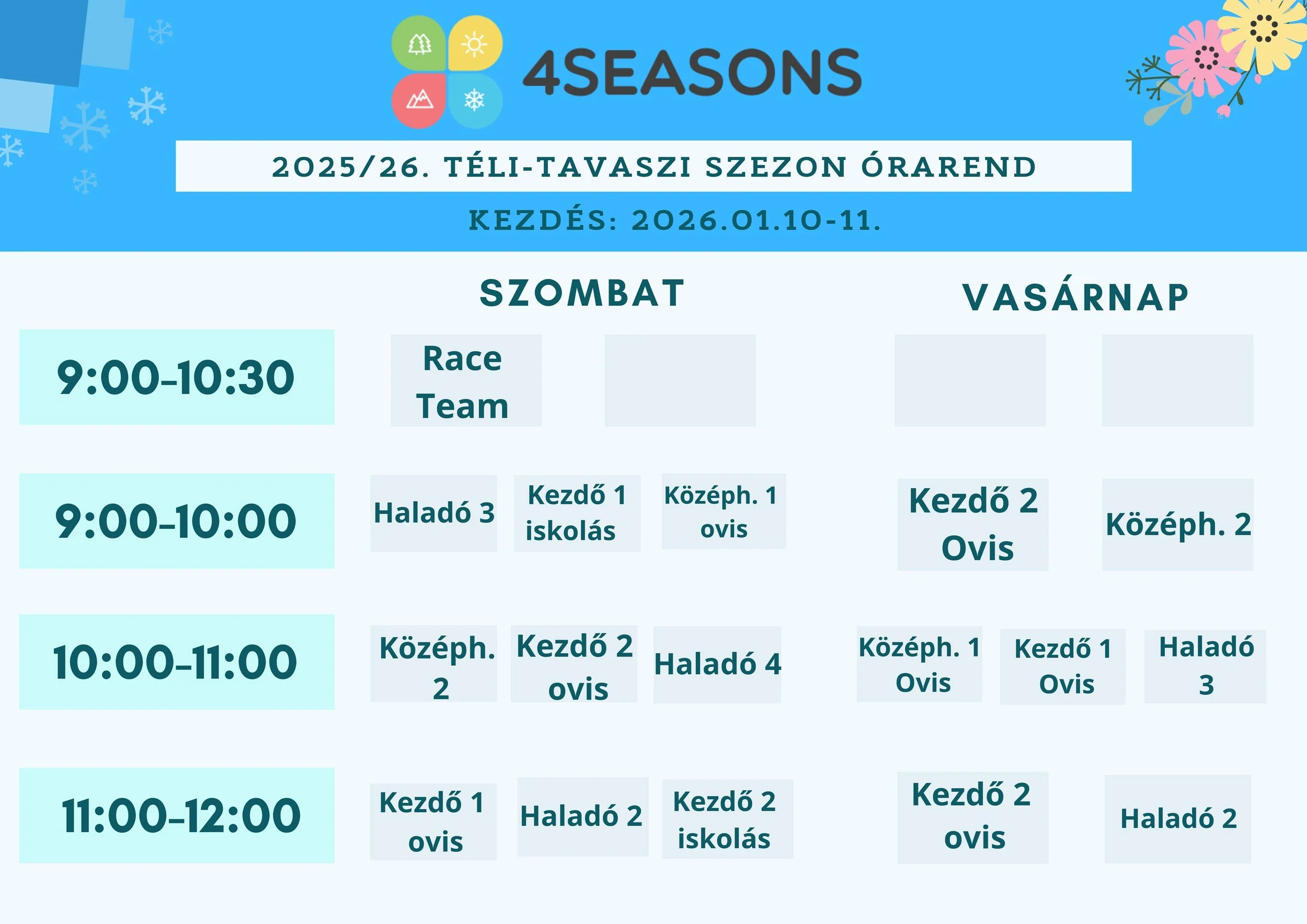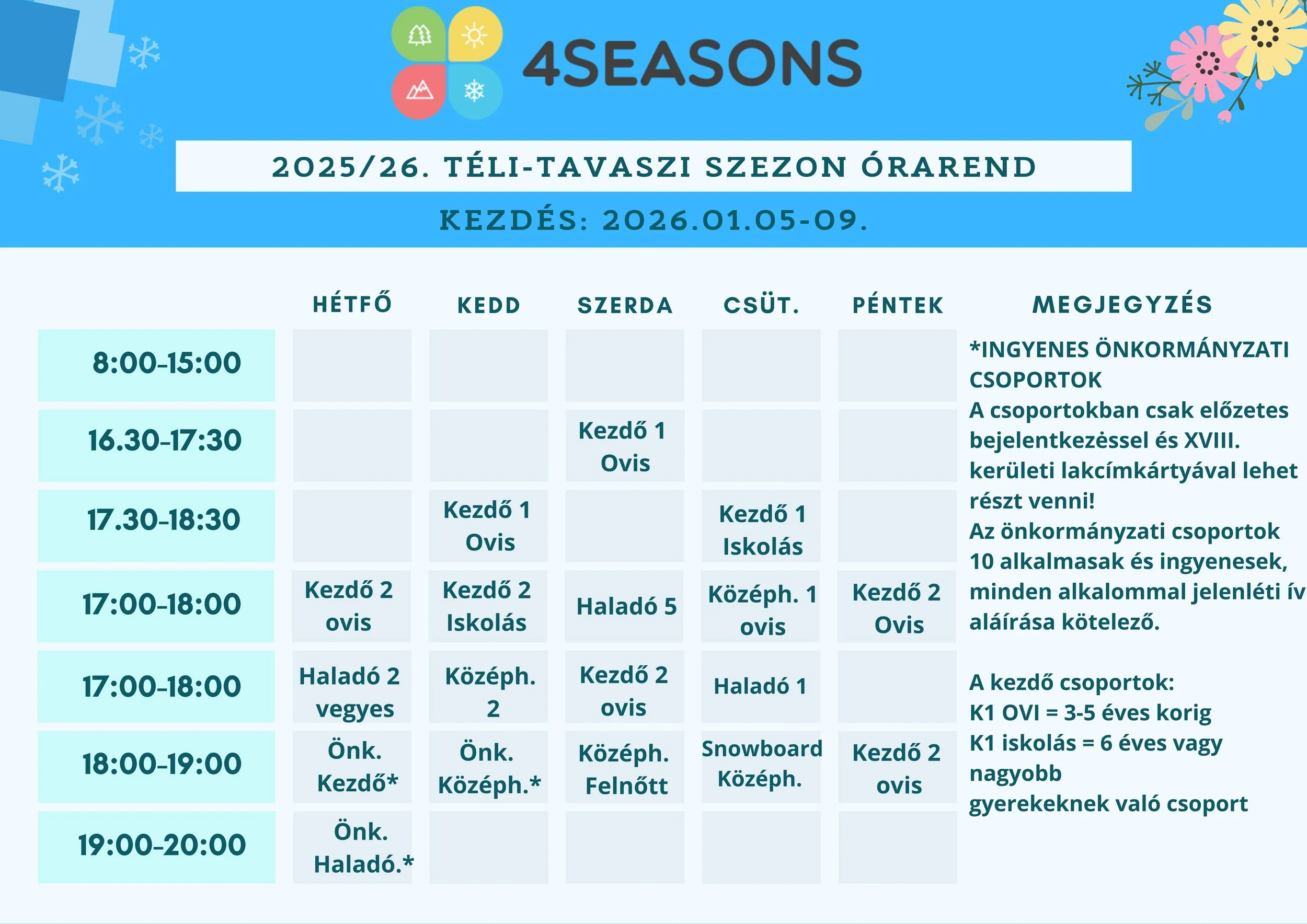 Síiskolánkban a csoportokat (gyermek és felnőtt) életkor és tudásszint szerint állítjuk össze. A sítanfolyamokon max. 10 tanítvánnyal foglalkoznak oktatóink (kezdő csoportoknál 2 oktató). A snowboardtanfolyamokon max. 6 tanítvánnyal foglalkoznak az oktatóink. Az edzések hétköznap délutánonként és hétvégén zajlanak. Az őszi és téli tanfolyamok folyamatosan 12 héten keresztül tartanak. Foglalkozásaink 50 percesek.